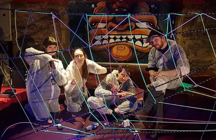 Reimagined Ruins is a group exhibition by 8 emerging artists who took part in ‘Room to Play’ – a 6-week course exploring interactive visuals with Tinderbox Collective and Ray Interactive. Artists came from different disciplines including music, dance, film, textiles, game-design, visual art and sculpture. After learning about the visual programming software Touch Designer and different sensors that respond to movement, touch and sound, the artists formed teams and worked together to create a series of artworks that make up this immersive installation and performance space.
