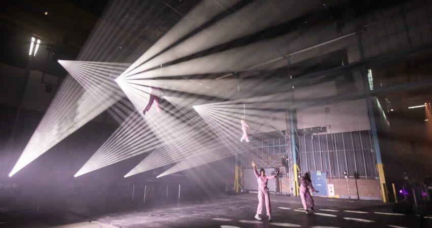 Also at this time, you might head to the Crane Shed to visit the Dance Space, powered by FunktionCreep. Here you’ll witness ‘SPECTRAL’ – a powerful and visually stunning immersive experience. Lit up by a fusion of light and lasers, the performance begins on the warehouse floor before performers spin 30 feet into the air, capturing the essence of labour and its transformation into something transcendent. A live soundtrack embraces the cavernous reverb of the performance space, layering field recordings with intricate synths and polyrhythms.